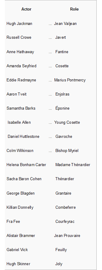 Cosette, Éponine, Enjolras, Javert, Thénardier, Mme.