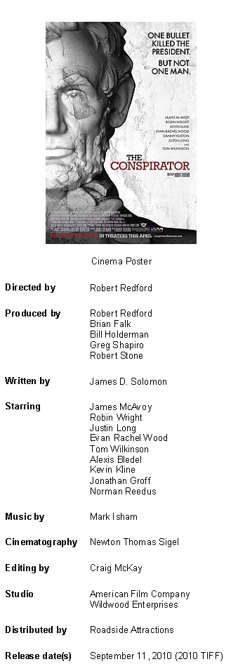 The Story In the wake of Abraham Lincoln's assassination, seven men and one woman are arrested and charged with conspiring to kill the President, the Vice-President, and the Secretary of State. The lone woman charged, Mary Surratt, owns a boarding house where John Wilkes Booth and others met and planned the simultaneous attacks. Against the ominous back-drop of post-Civil War Washington, newly-minted lawyer, Frederick Aiken, a 28-year-old Union war-hero, reluctantly agrees to defend Surratt before a military tribunal. As the trial unfolds, Aiken realises that things are not entirely as they seem, and that there may be an unexpected twist to the story of events. Cinema Trailer