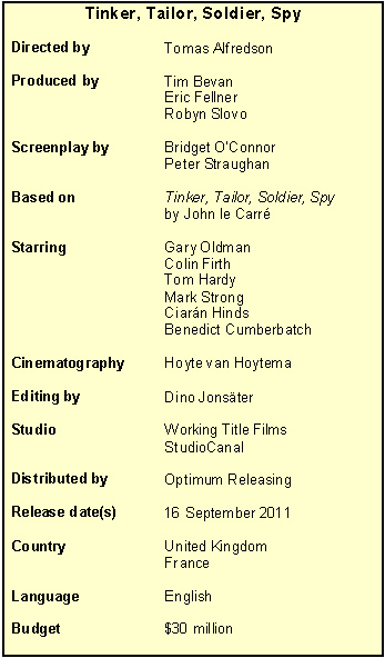 Background to the Film Tinker, Tailor, Soldier, Spy is a British thriller film based on the 1974 novel Tinker, Tailor, Soldier, Spy by John le Carré. The film is directed by Tomas Alfredson, from a screenplay by Bridget O'Connor and Peter Straughan. It was produced through the British company Working Title Films and financed by France's StudioCanal Development The project was initiated by Peter Morgan when he wrote a draft of the screenplay which he offered to Working Title Films to produce. Morgan dropped out as the writer due to personal reasons, but still served as an executive producer. Following Morgan's departure, Working Title Films hired Bridget O'Connor and Peter Straughan to redraft the script. This is the first English language film for Tomas Alfredson, who was confirmed as Director on 9 July 2009. The film was backed financially by France's StudioCanal and had a budget corresponding to US$ 30 million. Casting The director cast Gary Oldman in the role of George Smiley, and described the actor as having 'a great face' and 'the quiet intensity and intelligence that's needed'. Many actors were connected to the other roles at various points, but only days before filming started, Oldman was still the only lead actor who officially had been contracted. David Thewlis was in talks for a role at an early stage. Michael Fassbender was in talks at one point to star as Ricki Tarr, but the shooting schedule conflicted with his work on X-Men: First Class. Tom Hardy was cast instead. On 17 September 2010, it was confirmed that Mark Strong had joined the cast. Jared Harris was cast, but had to drop out because of scheduling conflicts with Sherlock Holmes: A Game of Shadows. He was replaced by Toby Jones. Filming Principal photography took place between 7 October and 22 December 2010 in London, Budapest and Istanbul. The production reunited Alfredson with cinematographer Hoyte van Hoytema and editor Dino Jonsäter, with whom he had made his previous film, Let the Right One In. Release The film premiered in competition at the 68th Venice International Film Festival on 5 September 2011. StudioCanal's British subsidiary, Optimum Releasing, was appointed to distribute the film in the UK, with a release date of 16 September 2011. American rights were acquired by Universal Pictures, which have a permanent first-look deal with Working Title, and which passed the rights to their subsidiary Focus Features, with a US release date of 9 December 2011. |