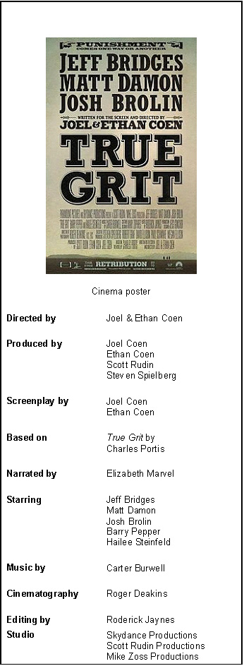 The Story Following the murder of her father by hired hand Tom Chaney, 14-year-old farm girl Mattie Ross sets out to capture the killer. To aid her, she hires the toughest US Marshal she can find, a man with 'true grit', Reuben J. 'Rooster' Cogburn. Mattie insists on accompanying Cogburn, whose drinking, sloth, and generally reprobate character do not support her faith in him. Against his wishes, she joins him in his trek into the Indian Nations in search of Chaney. They are joined by Texas Ranger LaBoeuf, who wants Chaney for his own purposes. The unlikely trio find danger and surprises on the journey, and each has their 'grit' tested. Background to the Film A new production of True Grit was rumoured as far back as February 2008. However production was not confirmed until March 2009. Ahead of shooting, Ethan Coen said that the film would be a more faithful adaptation of Charles Portis' novel than the 1969 version. Joel Coen said that the brothers did not want to "mess around with what we thought was a very compelling story and character". The film's producer, Scott Rudin, said that the Coens had taken a "formal, reverent approach" to the Western genre, with its emphasis on adventure and quest. "The patois of the characters, the love of language that permeates the whole film, makes it very much of a piece with their other films, but it is the least ironic in many regards". Open casting sessions were held in Texas in November 2009 for the role of Mattie Ross. The following month, Paramount Pictures announced a casting search for a 12- to 16-year-old girl, describing the character as a 'simple, tough as nails young woman' whose 'unusually steely nerves and straightforward manner are often surprising'. Steinfeld, then age 13, was selected for the role from a pool of 15,000 applicants. "It was, as you can probably imagine, the source of a lot of anxiety", Ethan Coen told The New York Times. "We were aware if the kid doesn't work, there's no movie". True Grit was shot in the Santa Fe, New Mexico area in March and April 2010, as well as in Granger and Austin, Texas. The film was officially released in the US on 22nd December 2010, after advance screenings earlier that month. The film opened the 61st Berlin International Film Festival on 10th February 2011. It